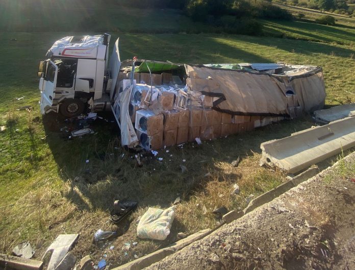 La fața locului s-a deplasat o autospecială cu modul de descarcerare, iar pompierii au găsit un autotren răsturnat în afara părții carosabile.