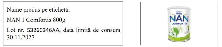 Autoritatea Națională Sanitară Veterinară și pentru Siguranța Alimentelor informează consumatorii despre o rechemare de produs. Nestlé România retrage voluntar de pe piață încă un lot pe lista de formulă de lapte. Este vorba despre produsul NAN 1 Comfortis 800g, care a fost retras din supermarketurile Lidl și Kaufland din România.
