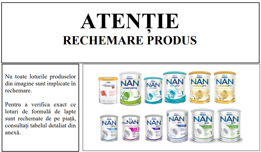“Ca măsură de precauție, Nestlé România recheamă voluntar o cantitate limitată din formulele de lapte cu datele de identificare menționate în anexă. Siguranța și bunăstarea sugarilor reprezintă prioritatea noastră absolută. Din prudență maximă, compania a decis să efectueze această rechemare voluntară, luând în considerare posibila prezență a cereulidei în loturile vizate de rechemare, din cauza unei probleme de neconformitate a unui ingredient provenit de la un furnizor extern, ingredient folosit în rețeta acestor produse. Furnizorul a fost anunțat, iar utilizarea ingredientului a fost oprită. Nu au fost semnalate cazuri confirmate de probleme de sănătate asociate consumului produselor din loturile menționate”, arată comunicarea Nestle România.