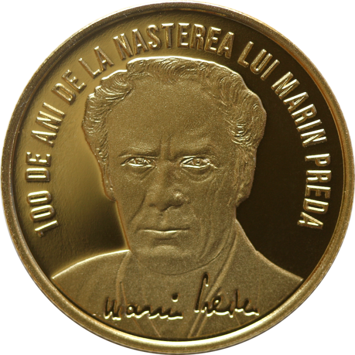 Monedele din aur cu tema 100 de ani de la nașterea lui Marin Preda vor fi însoţite de broşuri de prezentare și de certificate de autenticitate, redactate în limbile română, engleză şi franceză.