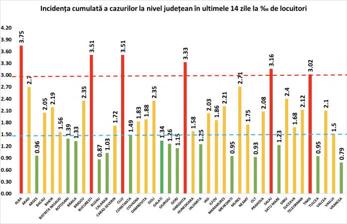 În cinci județe din România rata incidenței cazurilor la mia de locuitori a depăși 3 îmbolnăviri la mia de locuitori. Este vorba despre Alba, Cluj, Harghita, Sălaj și Timiș. Județul Alba înregistrează cea mai mare rată, 3,75, urmat de București, cu 3,51.