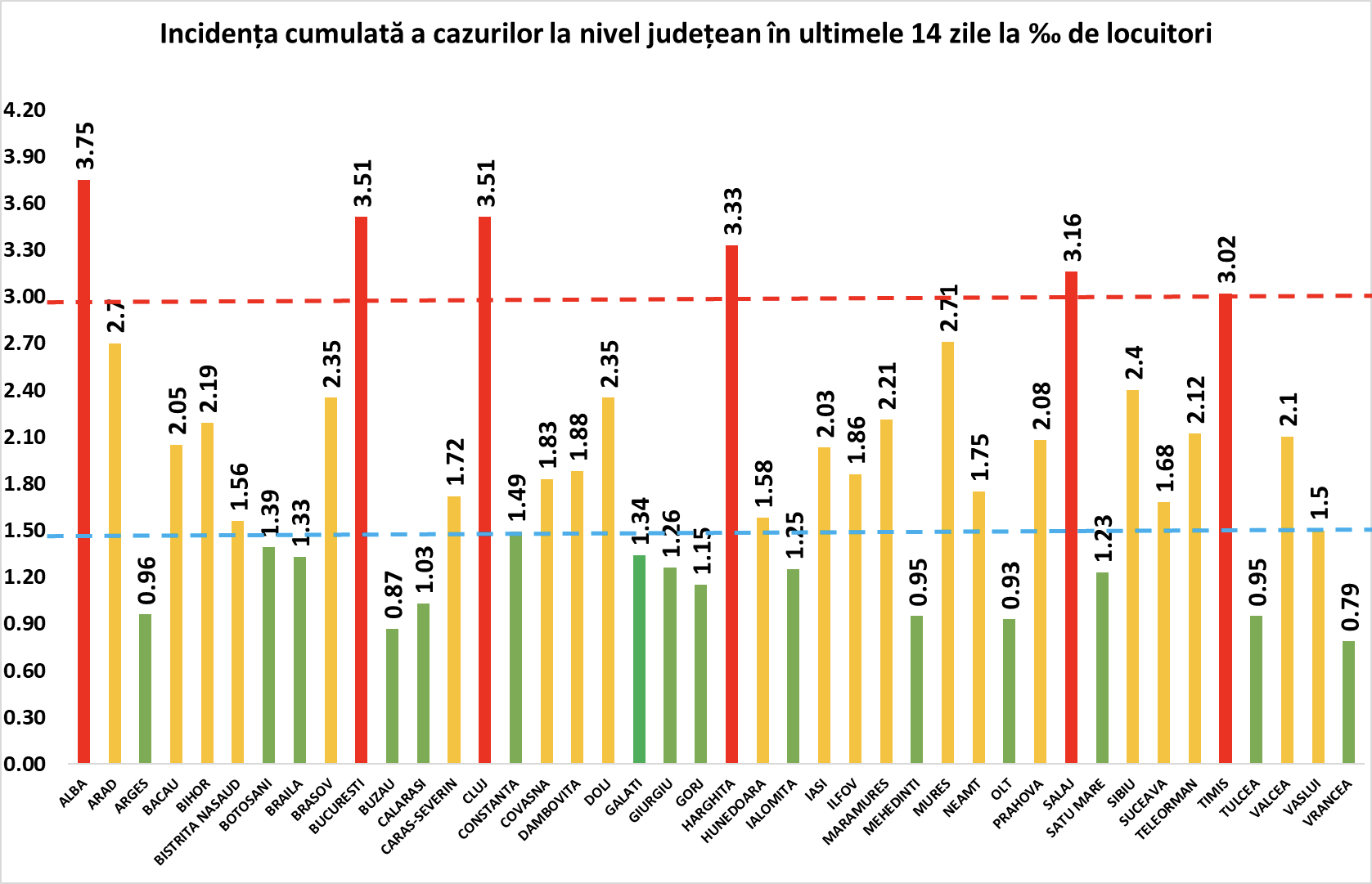 Clujul a înregistrat aceeași rată ca Bucureștiul, de 3,51 de cazuri la mia de locuitori. Harghita are 3,33, Sălajul 3,16, iar județul Timiș 3,02.