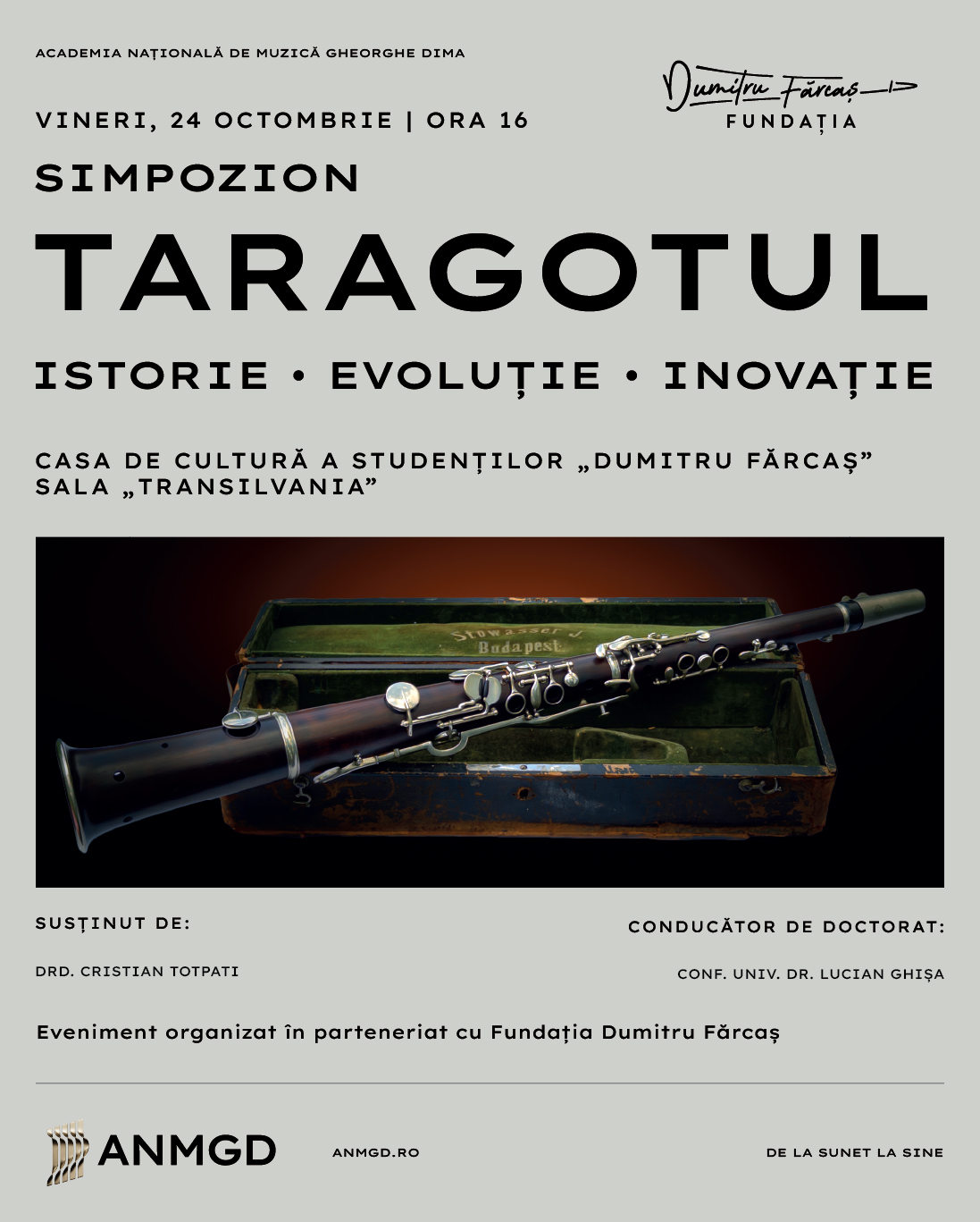 Ziua de vineri este marcată de două momente importante. De la ora 16:00, la Casa de Cultură a Studenților „Dumitru Fărcaș”, se va desfășura Simpozionul „Taragotul – Istorie, Evoluție, Inovație”, organizat de Academia Națională de Muzică „Gheorghe Dima” în parteneriat cu Fundația Dumitru Fărcaș. Drd. Cristian Totpati, taragotist și vicepreședinte al Fundației, va susține o prezentare despre istoria, organologia și evoluția taragotului, completată de o expoziție unicat dedicată acestui instrument. Intrarea este liberă.
