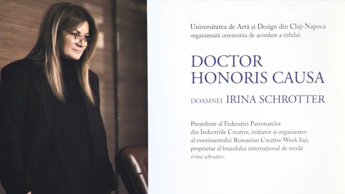 Irina Schrotter, creatoarea de modă și antreprenoarea unui business de succes, a primit miercuri, 17 aprilie, titlul de Doctor Honoris Causa din partea Universității de Artă și Design Cluj-Napoca. Aceasta a obținut acest titlu special datorită carierei impactante în lumea modei, dar și datorită sprijinului oferit studenților din cadrul universității.