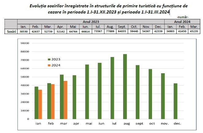 Înnoptările înregistrate în structurile de primire turistică în luna martie 2024, au însumat 76916, fiind cu 6,6% mai multe decât înnoptările lunii februarie 2024 și cu 13,8% mai puține decât în luna martie 2023.