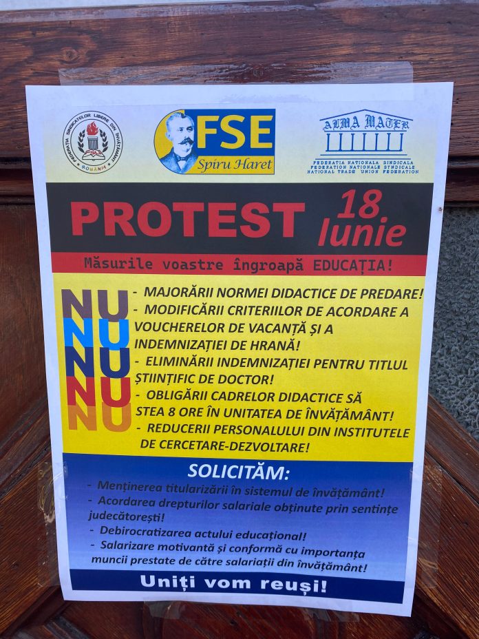 Federațiile sindicale din învățământ au anunțat că vor declanșa miercuri, 18 iunie, o grevă japoneză, în semn de protest față de posibile măsuri de austeritate pregătite de viitorul Guvern. Protestul se va desfășura la locul de muncă, în unități de învățământ preuniversitar și superior, în biblioteci centrale universitare și în institute de cercetare, fără întreruperea activității. Cadrele didactice vor purta semne distinctive, precum banderole sau ecusoane, potrivit digi24.