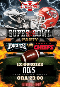 Finala campionatului național de fotbal american din Statele Unite ale Americii (NFL), Super Bowl 2023, va avea loc duminică, 12 februarie, între Kansas City Chiefs și Philadelphia Eagles. Deoarece meciul nu va fi televizat în România, reprezentanții clubului sportiv Cluj Crusaders au decis să organizeze singurul eveniment din Cluj-Napoca unde publicul va putea urmări integral show-ul celei mai populare întreceri sportive din lume.