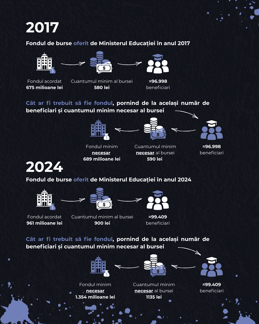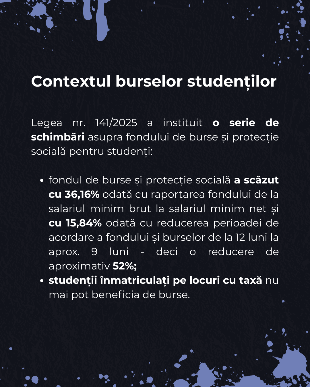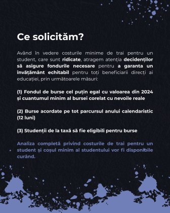 Așadar, având în vedere costurile lunare ridicate pe care studenții le au, necesare pentru continuarea studiilor universitare în condiții de minimă decență, dar și măsurile Legii nr. 141/2025 care au accentuat inechitățile din sistemul de educație și contribuie în continuare la creșterea abandonului universitar, solicităm Guvernului României abrogarea prevederilor care aduc atingere domeniului educației și alocarea, prin Legea bugetul de stat pentru anul 2025, în cadrul bugetului Ministerului Educației și Cercetării, la capitolul burse, a unui fond cel puțin egal cu cel din anul 2024, pentru a putea asigura sprijinul necesar studenților, pe întreaga perioadă a anului universitar și într-un cuantum minim rezonabil.