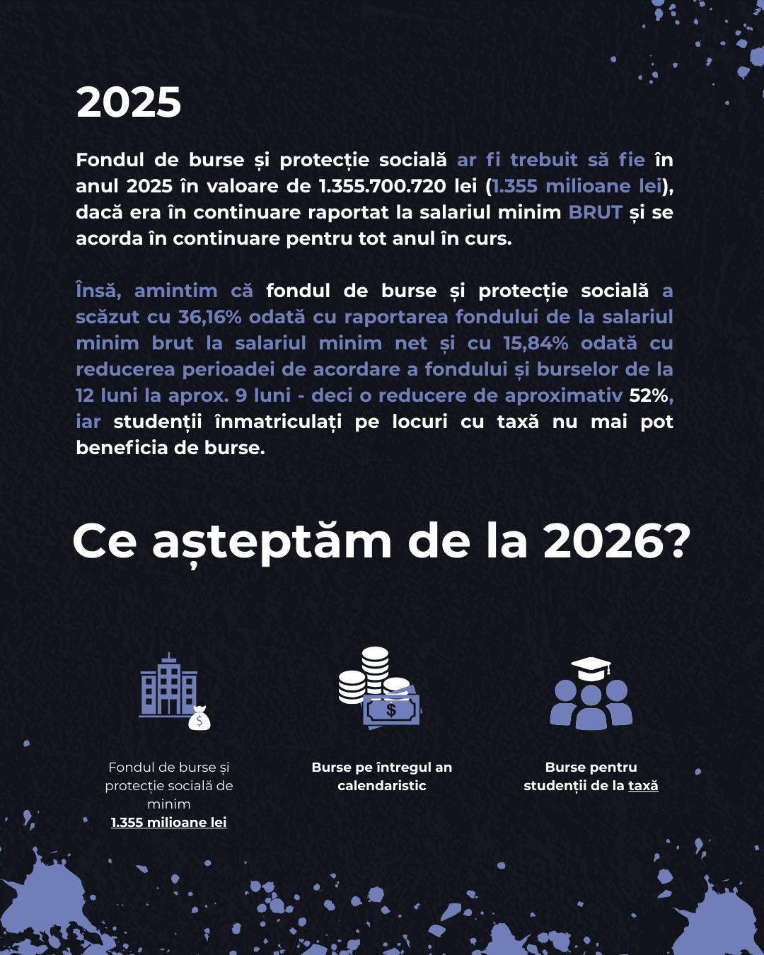 socială a studenților pentru anul 2026. Acest lucru presupune readucerea valorii acestuia la una cel puțin egală cu cea din 2024, iar bursele să fie acordate pe întregul an calendaristic (12 luni) inclusiv studenților de la taxă.